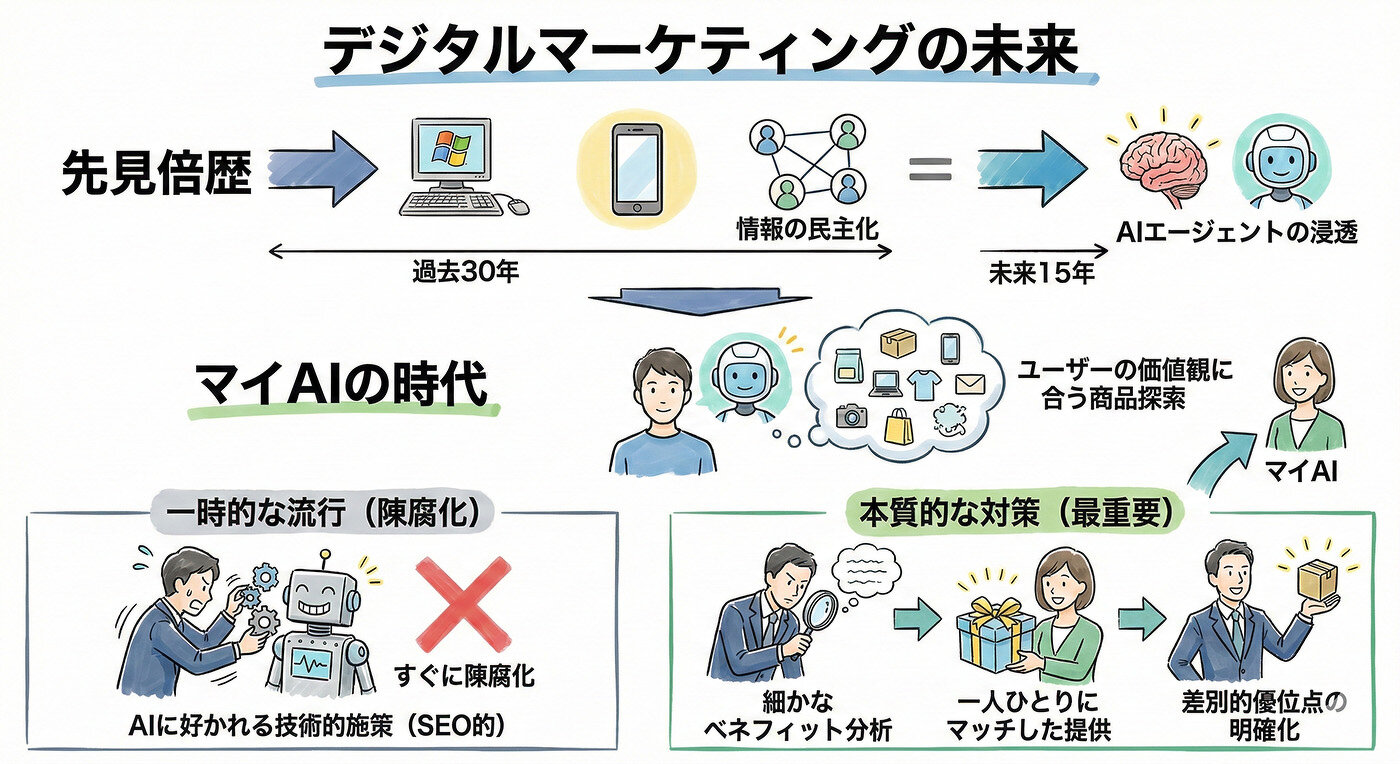 そういった時に、企業がマーケティングで考えることは、AIに好かれるように技術的な施しを行うこと(すなわちSEOと同等の考え方)が流行すると思われるが、恐らくそれはすぐに陳腐化しすると考える。