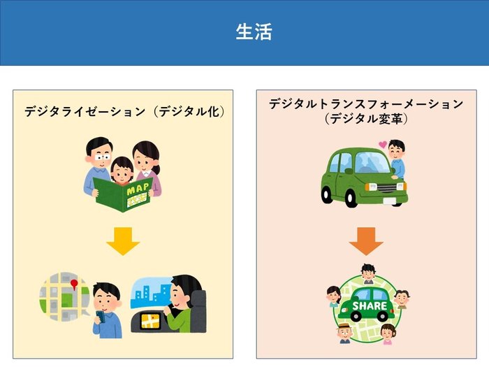昔はドライブに行くとなれば道路地図やドライブガイドブックを見るのが一般的でしたが、今ではスマホの地図アプリやカーナビを使っています。これがデジタライゼーションです。